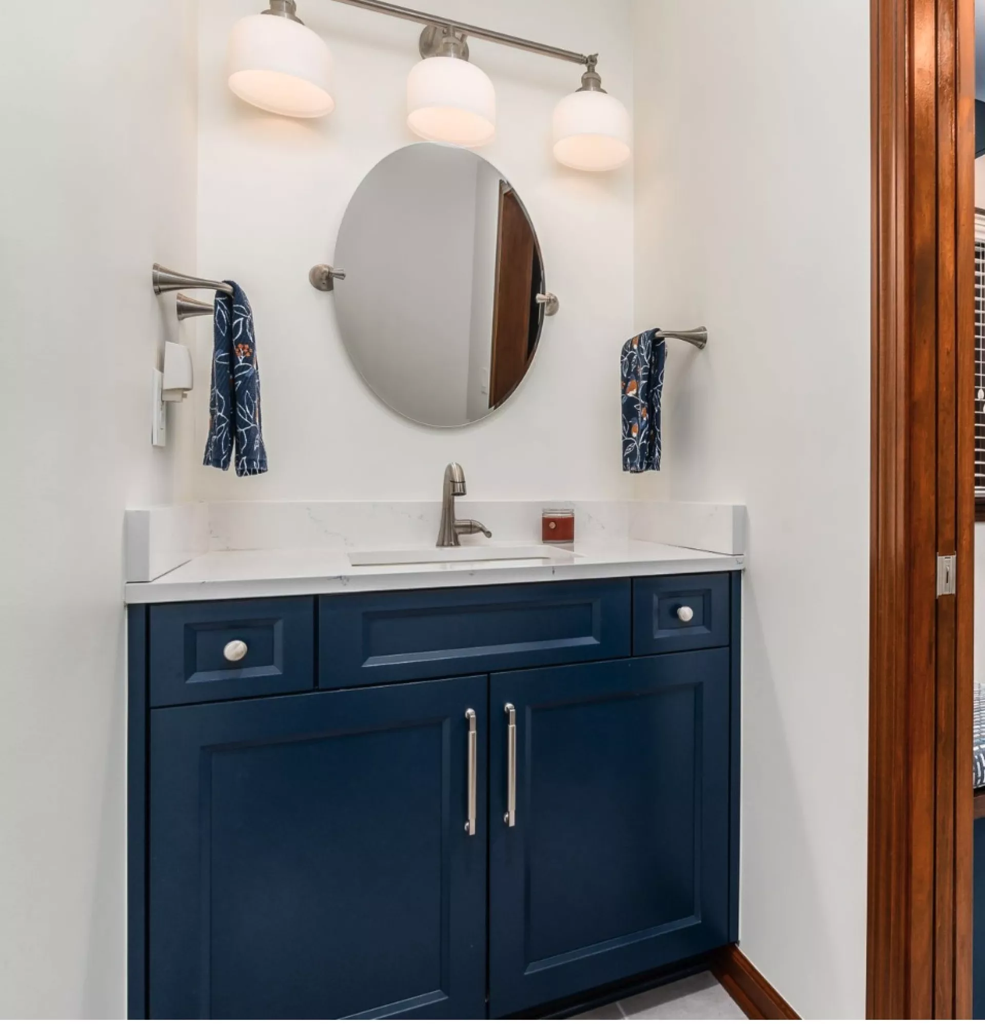 This layered approach of mixed metals adds dimension and gives the powder room a curated, designer-quality feel. It’s a subtle shift that instantly elevates even the simplest layout.